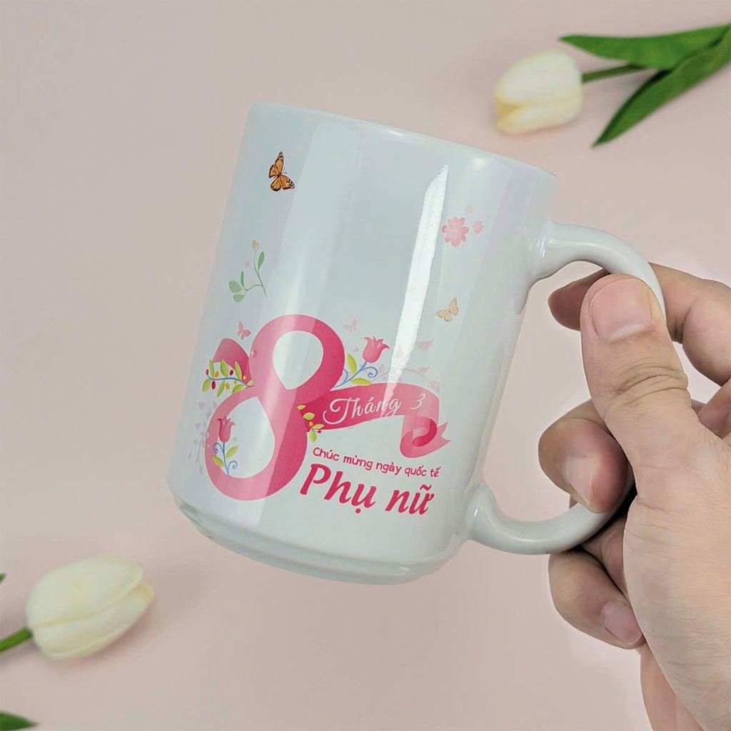 Ly sứ in logo là lựa chọn phổ biến dành cho nhân viên nữ hoặc khách hàng thân thiết. Sản phẩm có thể in thông điệp “Happy Women’s Day” kết hợp logo doanh nghiệp tạo điểm nhấn tinh tế. Ly sứ phù hợp làm quà đồng bộ số lượng lớn, chi phí tối ưu nhưng vẫn đảm bảo tính thẩm mỹ và hiệu quả nhận diện thương hiệu.
